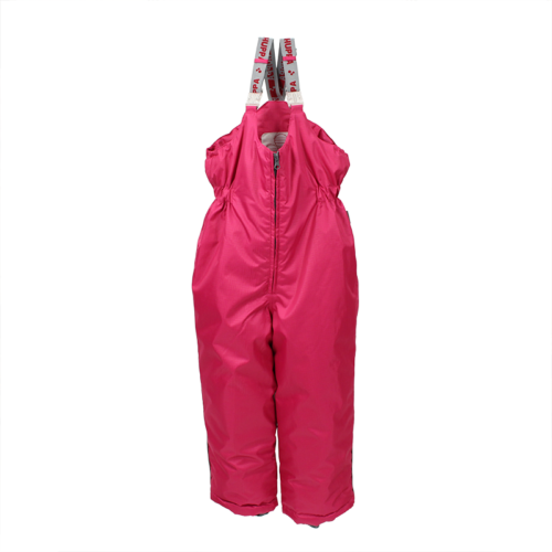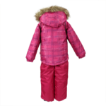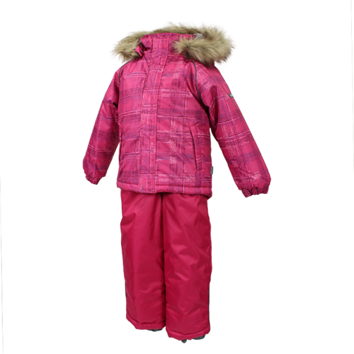 Bērnu jakas un bikšu komplekts. Ūdens un vēja necaurlaidīgs, gaisu caurlaidīgs virsējais audums. Jakai un biksēm ir mīksta odere. Piedurkņu un muguras daļā iestrādāta gumijas apdare. Noņemamā kapuce pie apkakles stiprināma ar velkro aizdari. Kapucei mākslīgās kažokādas malai. Biksēm ir augstais viduklis un regulējamas elastīgās lences. Jostas daļā iestrādāts gumijas paliktnis. Staras aizdarāmas ar stoperi. Ūdens necaurlaidīgi līmēti izšuvumi. Biksēm trūkst iekšējais staru apšuvums. Kā jakai, tā arī biksēm ir atstarojošas detaļas.