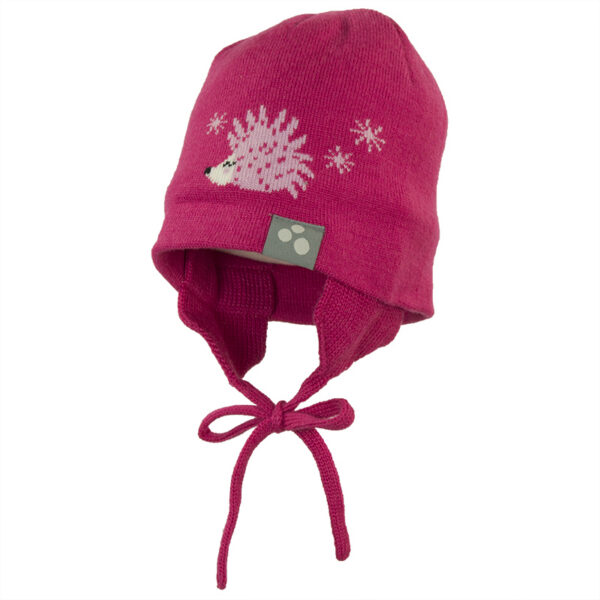 A thinner knitted spring-autumn hat for toddlers. The simple-cut hat is knitted from a 60% cotton, 40% acrylic yarn blend and the lining is soft cotton jersey. The hat is decorated with cute embroidery. For more comfortable wearing, the hat has earflaps and tying laces.