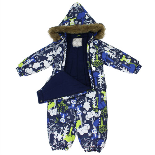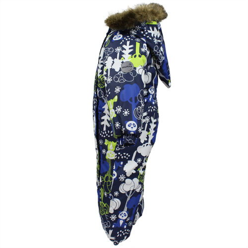 Children’s waterproof and windproof overall. Breathable fabric. Suitable for both babies or for toddlers who can already walk. Nice and soft flannel lining on the inside. Integrated elastic band at sleeve and leg ends. Removable hood attaches to the collar with press-studs to ensure safety when the wearer gets stuck. Sleeve and leg ends can be conveniently rolled down in sizes 68–80. Waterproof taped seams. The overall has no inner leg seam. Elastic foot straps. Removable faux fur trim on hood. Reflective elements on the fabric add safety when wearing in the dark.