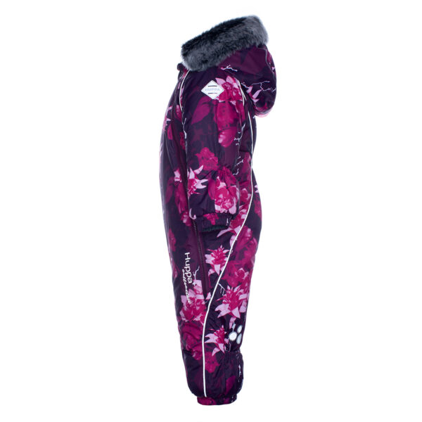 Babies’ modern waterproof and windproof winter overall. Breathable fabric. Flannel lining on the inside. Integrated elastic band at sleeve and leg ends and at waist on the back. The removable snap-on hood is safe for when the child gets stuck when playing outside. Sleeve and leg ends can be conveniently rolled down in sizes 68–80. Waterproof taped seams. The product comes with both silicone and rubber foot straps. Faux fur trim on hood. The high-performance top fabric is great to wear for children in any winter weather. The insides of leg ends are also covered with the main fabric to keep the child dry. Numerous reflective elements on the top fabric ensure visibility from all sides in the dark winter time.