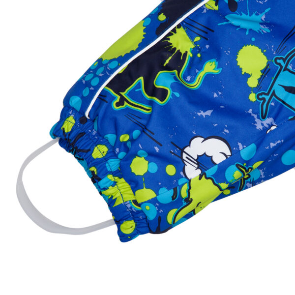 Babies’ modern waterproof and windproof winter overall. Breathable fabric. Flannel lining on the inside. Integrated elastic band at sleeve and leg ends and at waist on the back. The removable snap-on hood is safe for when the child gets stuck when playing outside. Sleeve and leg ends can be conveniently rolled down in sizes 68–80. Waterproof taped seams. The product comes with both silicone and rubber foot straps. Faux fur trim on hood. The high-performance top fabric is great to wear for children in any winter weather. The insides of leg ends are also covered with the main fabric to keep the child dry. Numerous reflective elements on the top fabric ensure visibility from all sides in the dark winter time.
