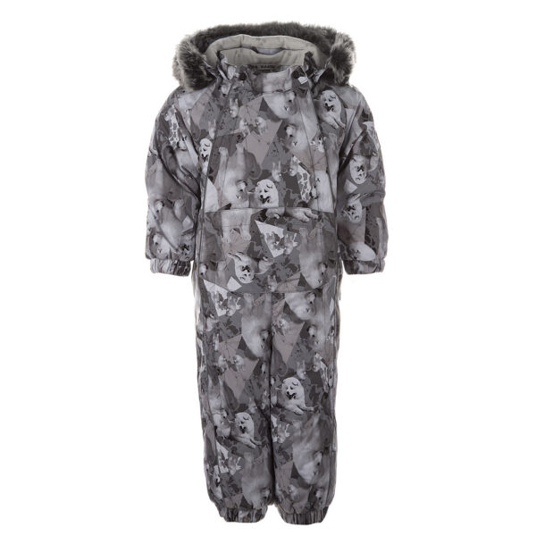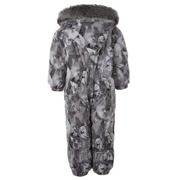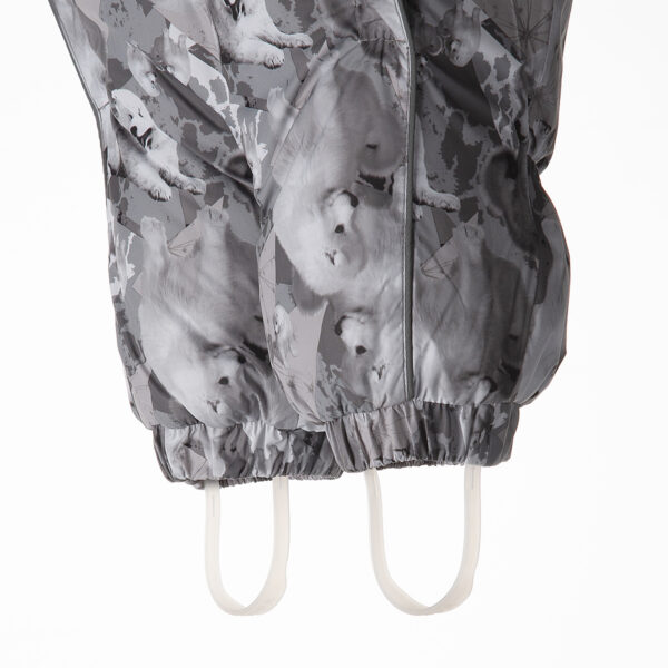 Babies’ waterproof and windproof winter overall. Breathable fabric. Flannel lining on the inside. Integrated elastic band at sleeve and leg ends and at waist on the back. Removable snap-on hood. Sleeve and leg ends can be conveniently rolled down in sizes 68–80. Waterproof taped seams. The overall has no inner leg seam. The product comes with both silicone and rubber foot straps. Faux fur trim on hood. Reflective elements on fabric.