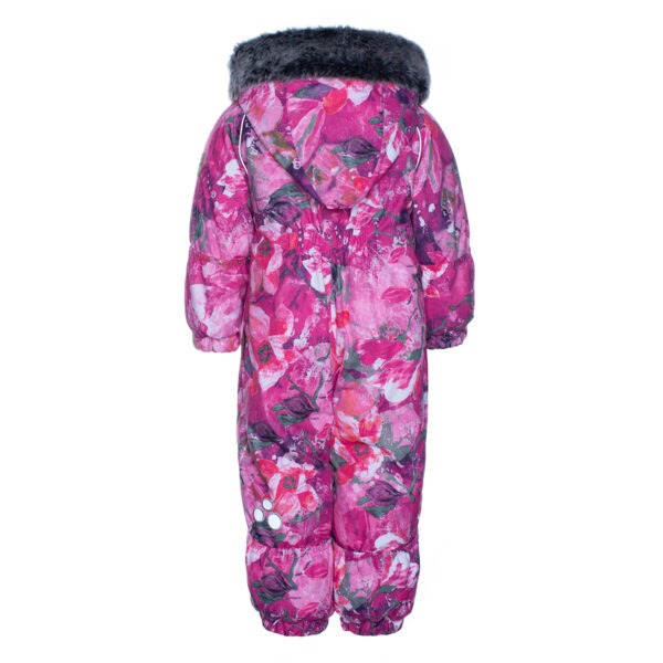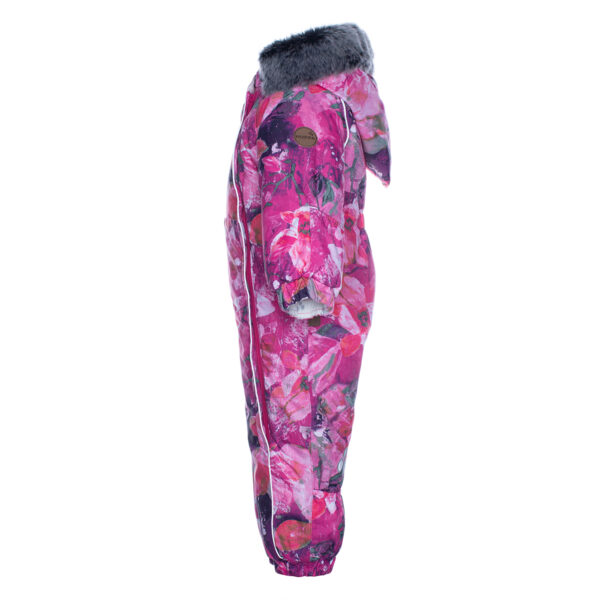 Babies’ waterproof and windproof winter overall. Breathable fabric. Flannel lining on the inside. Integrated elastic band at sleeve and leg ends and at waist on the back. Removable snap-on hood. Sleeve and leg ends can be conveniently rolled down in sizes 68–80. Waterproof taped seams. The overall has no inner leg seam. The product comes with both silicone and rubber foot straps. Faux fur trim on hood. Reflective elements on fabric.