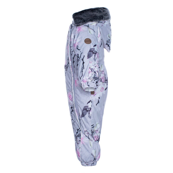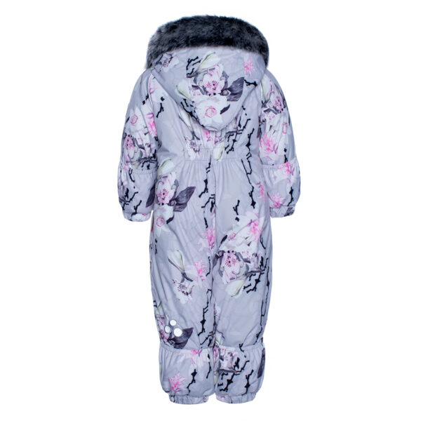 Babies’ waterproof and windproof winter overall. Breathable fabric. Flannel lining on the inside. Integrated elastic band at sleeve and leg ends and at waist on the back. Removable snap-on hood. Sleeve and leg ends can be conveniently rolled down in sizes 68–80. Waterproof taped seams. The overall has no inner leg seam. The product comes with both silicone and rubber foot straps. Faux fur trim on hood. Reflective elements on fabric.