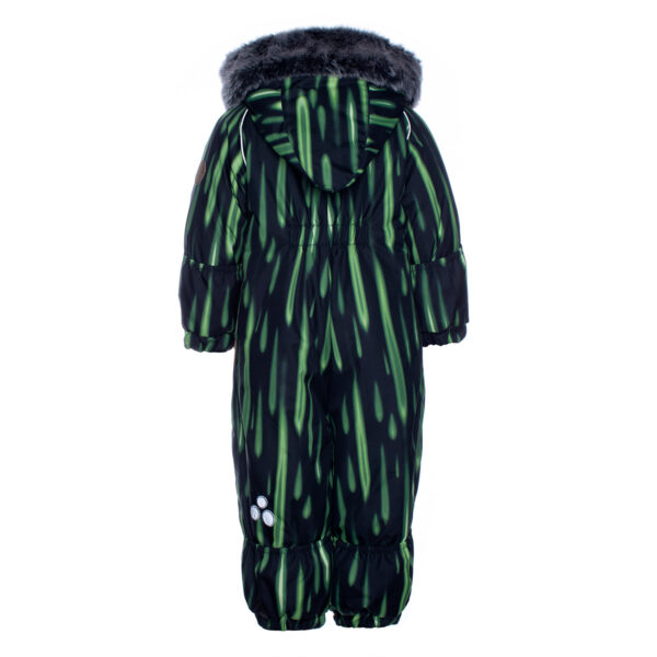 Babies’ waterproof and windproof winter overall. Breathable fabric. Flannel lining on the inside. Integrated elastic band at sleeve and leg ends and at waist on the back. Removable snap-on hood. Sleeve and leg ends can be conveniently rolled down in sizes 68–80. Waterproof taped seams. The overall has no inner leg seam. The product comes with both silicone and rubber foot straps. Faux fur trim on hood. Reflective elements on fabric.