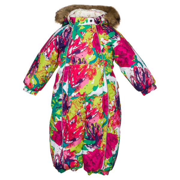 Babies’ waterproof and windproof winter overall. Breathable fabric. Flannel lining on the inside. Integrated elastic band at sleeve and leg ends and at waist on the back. Removable snap-on hood. Sleeve and leg ends can be conveniently rolled down in sizes 68–80. Waterproof taped seams. The overall has no inner leg seam. The product comes with both silicone and rubber foot straps. Faux fur trim on hood. Reflective elements on fabric.