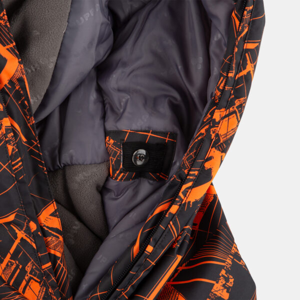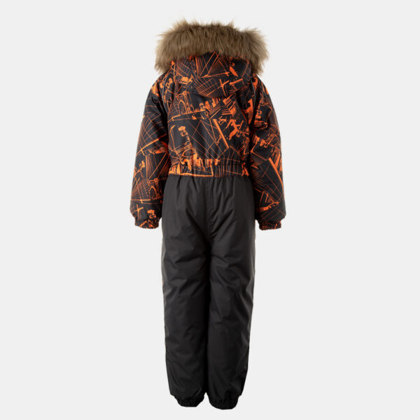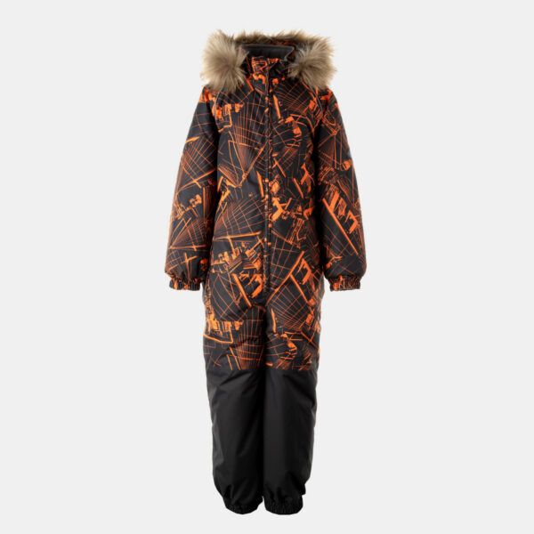 Bērnu ūdens un vēja necaurlaidīgs kombinezons. Gaisu caurlaidīgs virsējais audums. Kombinezonam mīksta odere. Piedurknēs un staru malās iestrādāta gumijas apdare. Noņemamā kapuce pie apkakles stiprināma ar velkro aizdari. Priekšpusē apšūtas kabatas. Ūdens necaurlaidīgi līmēti izšuvumi. Komplektā elastīgas pazolītes. Kapucei noņemama mākslīgās kažokādas mala. Auduma virspusē atstarojošas detaļas.