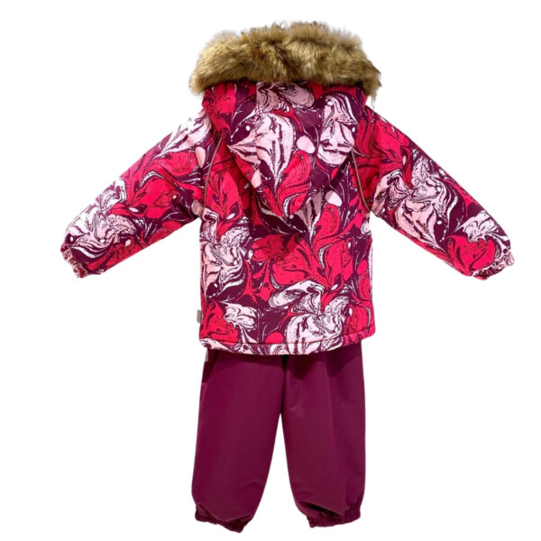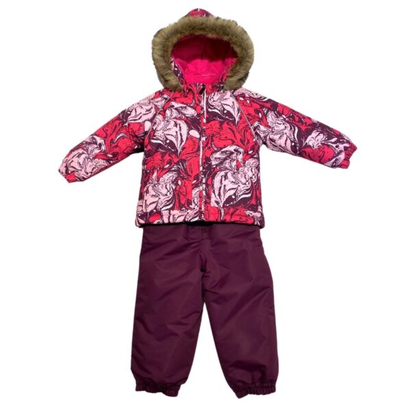 Klasisks divdaļīgs komplekts ar vatelīna pildījumu mazuļiem. Mīksta kokvilnas flaneļa odere, gaisa caurlaidīgs un ūdeni atgrūdošs virsējais audums. Bikses ar paaugstinātu vidukļa daļu un nolīmētu sēžas šuvi. Noņemama kapuce ar kažokādas apmali, regulējamas gumijas lences un ir divas kabatas.