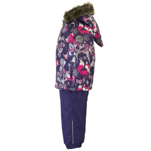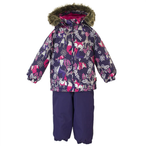 Klasisks divdaļīgs komplekts ar vatelīna pildījumu mazuļiem. Mīksta kokvilnas flaneļa odere, gaisa caurlaidīgs un ūdeni atgrūdošs virsējais audums. Bikses ar paaugstinātu vidukļa daļu un nolīmētu sēžas šuvi. Noņemama kapuce ar kažokādas apmali, regulējamas gumijas lences un ir divas kabatas.