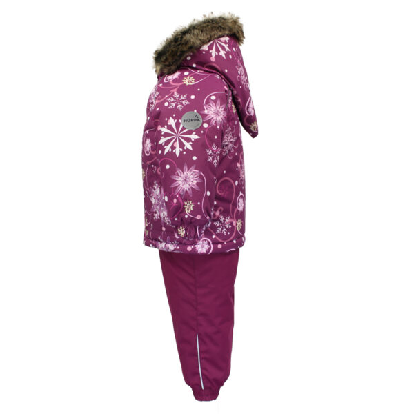 Klasisks divdaļīgs komplekts ar vatelīna pildījumu mazuļiem. Mīksta kokvilnas flaneļa odere, gaisa caurlaidīgs un ūdeni atgrūdošs virsējais audums. Bikses ar paaugstinātu vidukļa daļu un nolīmētu sēžas šuvi. Noņemama kapuce ar kažokādas apmali, regulējamas gumijas lences un ir divas kabatas.