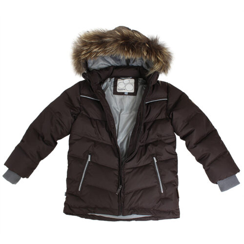 Bērnu ūdens un vēja necaurlaidīga dūnu jaka. Gaisu caurlaidīgs virsējais audums. Mīksta jakas odere. Pildījumā dūnu spalvas un spalvas. Noņemamā kapuce pie apkakles stiprināma ar velkro aizdari. Rievotas piedurknes. Rāvējslēdzēja aizdare. Priekšpusē aizdarāmas kabatas. Kapucei noņemama mākslīgās kažokādas mala. Auduma virspusē atstarojošas detaļas.