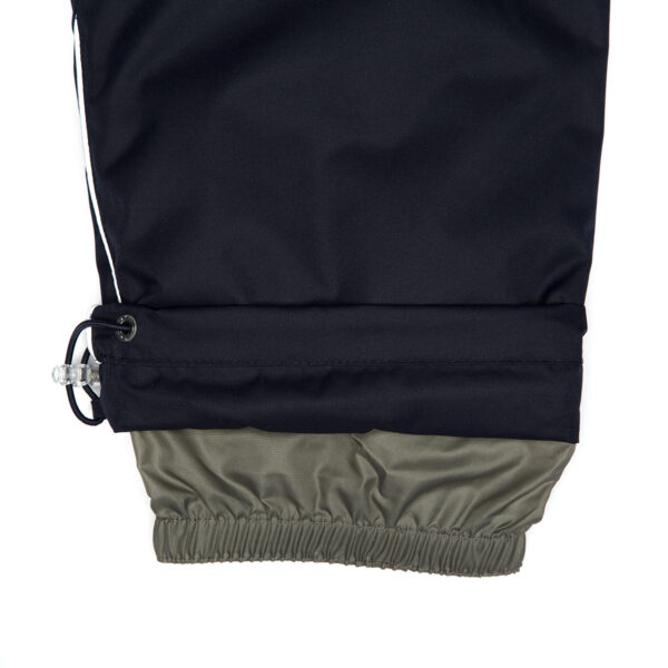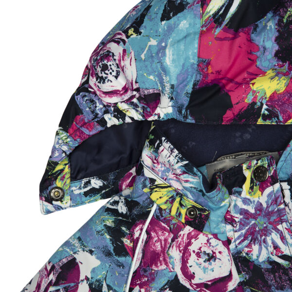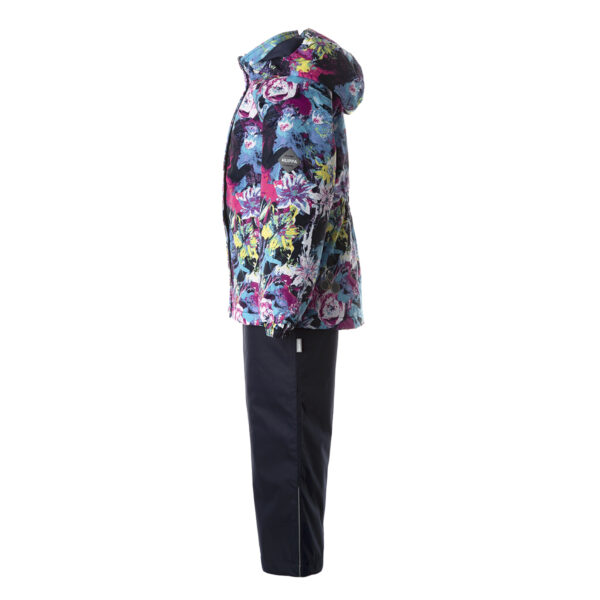 Bērnu jakas un bikšu komplekts Ūdens un vēja necaurlaidīgs, gaisu caurlaidīgs virsējais audums Jakas un bikšu odere no mīksta auduma Piedurknēs iestrādāta gumijas apdare Noņemamā kapuce pie apkakles piestiprināma ar velkro aizdari Kapucei noņemama mākslīgās kažokādas mala Biksēm ir augstā vidukļa daļa un regulējamas, elastīgas lences Vidukļa daļā un starās iestrādāta gumijas apdare Ūdens necaurlaidīgi līmēti izšuvumi Biksēm komplektā elastīgas pazoles Kā jakai, tā arī biksēm ir atstarojošas detaļas