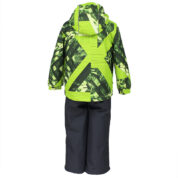Bērnu starpsezonas jakas un bikšu komplekts. Ūdens- un vēja izturīgs, elpojošs virsaudums. Jakas un bikšu iekšpusē ir mīksts oderaudums. Piedurkņu galos un kapuces malā iestrādāta gumijas lente. Noņemamā kapuce pie apkakles nostiprināma ar spiedpogām. Biksēm ir augstāka jostasvieta un regulējamas, elastīgas lences. Jostasvietā iestrādāta gumijas lente. Staru galos gumijas auklas tunelis ar iestrādātām atdurēm. Ūdensnoturīga, stepēta sēžas šuve. Biksēm nav staras iekšējās šuves. Gan jakai, gan biksēm ir atstarojošas detaļas.
