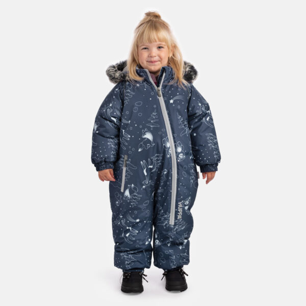 Zīdaiņu ūdens un vēja necaurlaidīgs ziemas kombinezons ar 300 g siltinājumu. Elpojošais audums un mīkstā flaneļa odere iekšpusē nodrošina komfortu visas dienas garumā. Praktiska dizaina dēļ kombinezonam ir elastīgas piedurkņu un bikšu galiņu malas, kā arī elastīga josta muguras daļā. Noņemamā kapuce ar spiedpogām ir droša. Izmēros 68–80 piedurkņu un bikšu galus var atlocīt, lai pagarinātu valkāšanas laiku. Pilnībā līmētas ūdensnecaurlaidīgas šuves, mākslīgās kažokādas kapuces apdare un atstarojošās detaļas uz virsējā auduma piešķir dizainam komfortu, drošību un stilu.