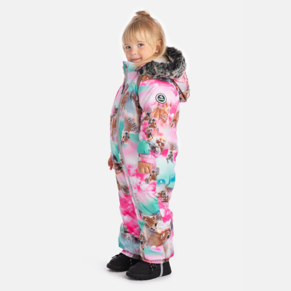 Zīdaiņu ūdens un vēja necaurlaidīgs ziemas kombinezons ar 300 g siltinājumu. Elpojošais audums un mīkstā flaneļa odere iekšpusē nodrošina komfortu visas dienas garumā. Praktiska dizaina dēļ kombinezonam ir elastīgas piedurkņu un bikšu galiņu malas, kā arī elastīga josta muguras daļā. Noņemamā kapuce ar spiedpogām ir droša. Izmēros 68–80 piedurkņu un bikšu galus var atlocīt, lai pagarinātu valkāšanas laiku. Pilnībā līmētas ūdensnecaurlaidīgas šuves, mākslīgās kažokādas kapuces apdare un atstarojošās detaļas uz virsējā auduma piešķir dizainam komfortu, drošību un stilu.