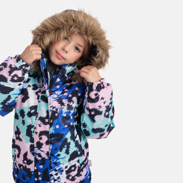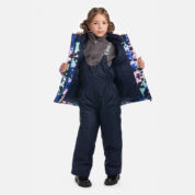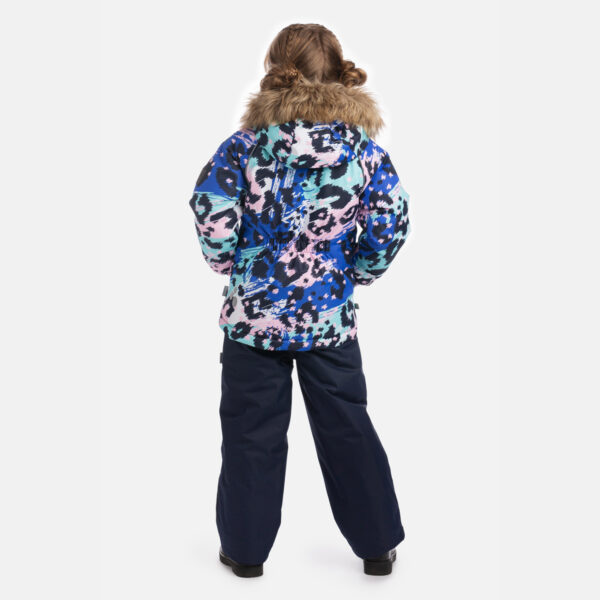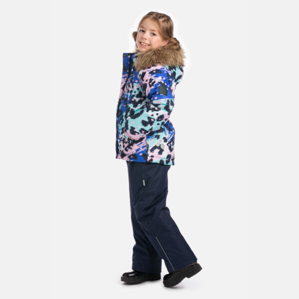 Bērnu jakas un bikšu komplekts. Ūdens un vēja necaurlaidīgs, gaisu caurlaidīgs virsējais audums. Jakas un bikšu odere no mīksta auduma. Piedurknēs iestrādāta gumijas apdare. Noņemamā kapuce pie apkakles piestiprināma ar velkro aizdari. Kapucei noņemama mākslīgās kažokādas mala. Biksēm ir augstā vidukļa daļa un regulējamas, elastīgas lences. Vidukļa daļā un starās iestrādāta gumijas apdare. Ūdens necaurlaidīgi līmēti izšuvumi. Biksēm komplektā elastīgas pazoles. Kā jakai, tā arī biksēm ir atstarojošas detaļas.