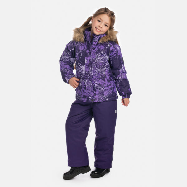 Bērnu jakas un bikšu komplekts. Ūdens un vēja necaurlaidīgs, gaisu caurlaidīgs virsējais audums. Jakas un bikšu odere no mīksta auduma. Piedurknēs iestrādāta gumijas apdare. Noņemamā kapuce pie apkakles piestiprināma ar velkro aizdari. Kapucei noņemama mākslīgās kažokādas mala. Biksēm ir augstā vidukļa daļa un regulējamas, elastīgas lences. Vidukļa daļā un starās iestrādāta gumijas apdare. Ūdens necaurlaidīgi līmēti izšuvumi. Biksēm komplektā elastīgas pazoles. Kā jakai, tā arī biksēm ir atstarojošas detaļas.