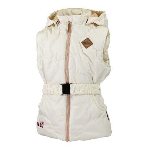 Girls´ vest. Lining: taffeta lining + velvet, cotton and polyester blend, thin wadding (120 g insulation). Beautiful embroidery on the vest. Removable hood with snaps.