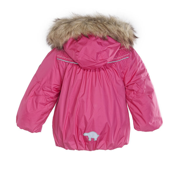 A quilted jacket for toddlers made of soft fabric with a thick padding for winter walks. The jacket is lined with comfortable “Coral-fleece” in the body and taffeta lining in the sleeves for easier hand slipping. The hood, which can be removed with snaps, protects against cold wind, the elastic cuffs protect against snow, and plenty of reflective details add safety when moving around in the dark.