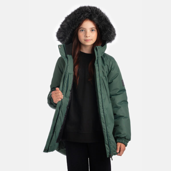 Bērnu ūdens un vēja necaurlaidīga jaka. Gaisu caurlaidīgs virsējais audums. Jakas odere no mīksta auduma. Noņemamā kapuce pie apkakles piestiprināma ar velkro aizdari. Piedurknēs un vidukļa daļā iestrādāta gumijas apdare. Rāvējslēdzēja aizdare. Priekšpusē apšūtas kabatas ar aizdari. Kapucei noņemama mākslīgās kažokādas mala. Auduma virspusē atstarojošas detaļas.