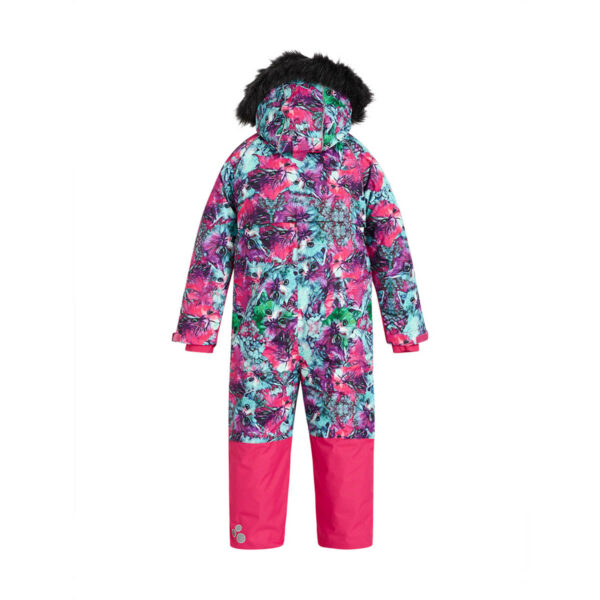 Bērnu ūdens un vēja necaurlaidīgs kombinezons Gaisu caurlaidīgs virsējais audums Mīksta odere Noņemamā kapuce pie apkakles stiprināma ar velkro aizdari Kapuces malā un aizmugurē iestrādāta gumijas apdare Rievota piedurkņu apdare Regulējamas piedurknes Priekšpusē apšūts rāvējslēdzējs Priekšpusē kabatas ar apdari Iestrādāti krāsaini pogcaurumi Sniega necaurlaidīgas staras Staras aizdarāmas ar stoperi Ūdens necaurlaidīgi līmēti izšuvumi Kapucei noņemama mākslīgās kažokādas mala Auduma virspusē atstarojošas detaļas