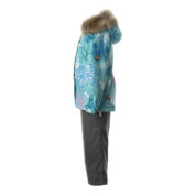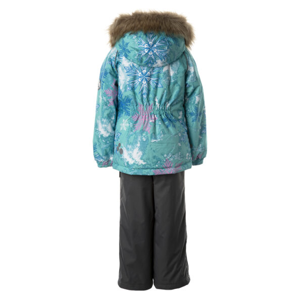 Bērnu jakas un bikšu komplekts Ūdens un vēja necaurlaidīgs, gaisu caurlaidīgs virsējais audums Jakas un bikšu odere no mīksta auduma Piedurknēs iestrādāta gumijas apdare Noņemamā kapuce pie apkakles piestiprināma ar velkro aizdari Kapucei noņemama mākslīgās kažokādas mala Biksēm ir augstā vidukļa daļa un regulējamas, elastīgas lences Vidukļa daļā un starās iestrādāta gumijas apdare Ūdens necaurlaidīgi līmēti izšuvumi Biksēm komplektā elastīgas pazoles Kā jakai, tā arī biksēm ir atstarojošas detaļas
