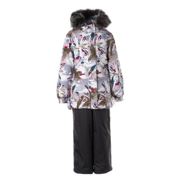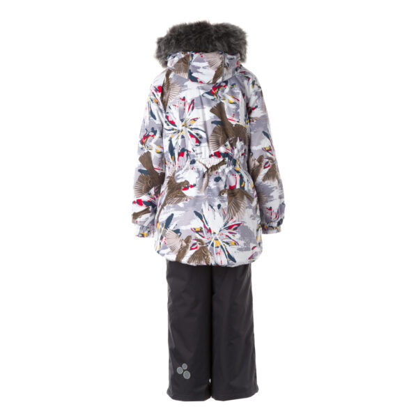 Children’s jacket and pants set. Waterproof and windproof, breathable top fabric. Soft mesh lining on the inside of the jacket and pants. Integrated elastic band at sleeve ends and on the waist. Removable snap-on hood. Removable faux fur trim on hood. The pants have removable elastic and adjustable braces. Integrated elastic band on waist. Snow gaiters at leg ends. Drawstring tunnel with stoppers at leg ends. Waterproof taped seams. Reflective elements on both jacket and pants.