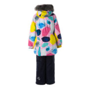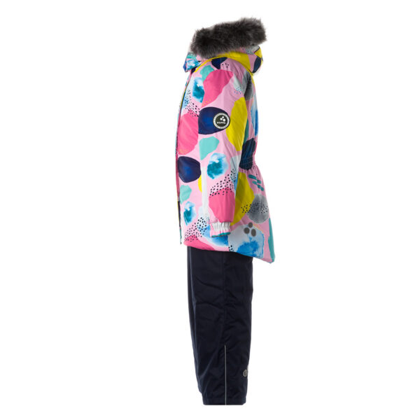 Children’s jacket and pants set. Waterproof and windproof, breathable top fabric. Soft mesh lining on the inside of the jacket and pants. Integrated elastic band at sleeve ends and on the waist. Removable snap-on hood. Removable faux fur trim on hood. The pants have removable elastic and adjustable braces. Integrated elastic band on waist. Snow gaiters at leg ends. Drawstring tunnel with stoppers at leg ends. Waterproof taped seams. Reflective elements on both jacket and pants.