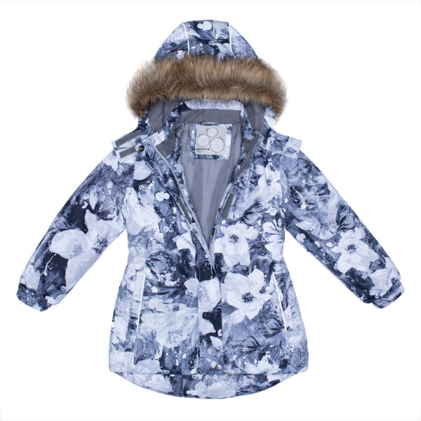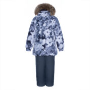 Children’s jacket and pants set. Waterproof and windproof, breathable top fabric. Soft mesh lining on the inside of the jacket and pants. Integrated elastic band at sleeve ends and on the waist. Removable snap-on hood. Removable faux fur trim on hood. The pants have removable elastic and adjustable braces. Integrated elastic band on waist. Snow gaiters at leg ends. Drawstring tunnel with stoppers at leg ends. Waterproof taped seams. Reflective elements on both jacket and pants.