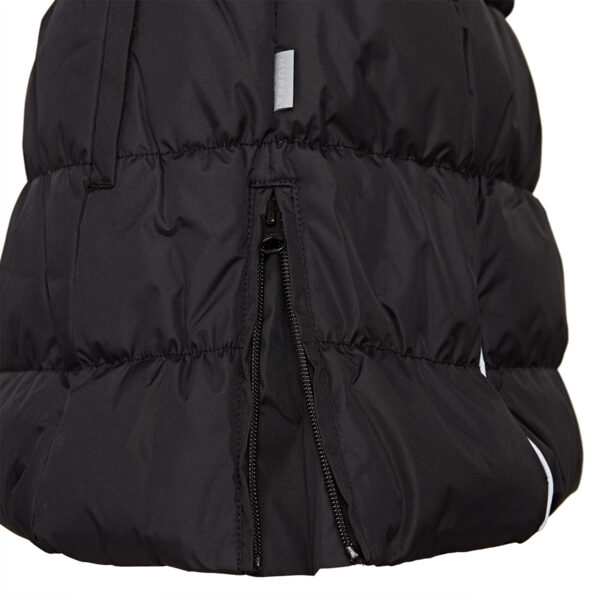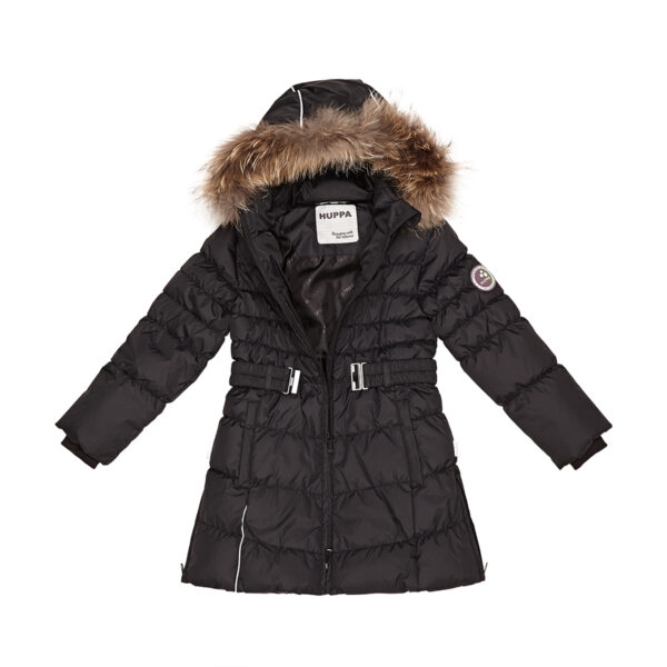 Girls´ down coat made of soft fabric for the coldest weather. The coat has a comfortable taffeta lining and a breathable and waterproof outer fabric. The coat has a removable hood with a separate removable fur. Ribbed cuffs. The coat has a belt with a buckle. Reflective details on the hood and in the seams of the coat´s hem help. The coat has a zippered inner pocket and two outer pockets.