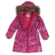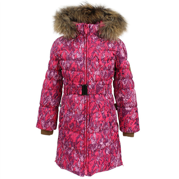 Girls´ down coat made of soft fabric for the coldest weather. The coat has a comfortable taffeta lining and a breathable and waterproof outer fabric. The coat has a removable hood with a separate removable fur. Ribbed cuffs. The coat has a belt with a buckle. Reflective details on the hood and in the seams of the coat´s hem help. The coat has a zippered inner pocket and two outer pockets.