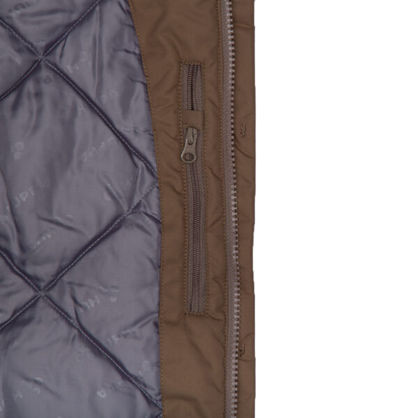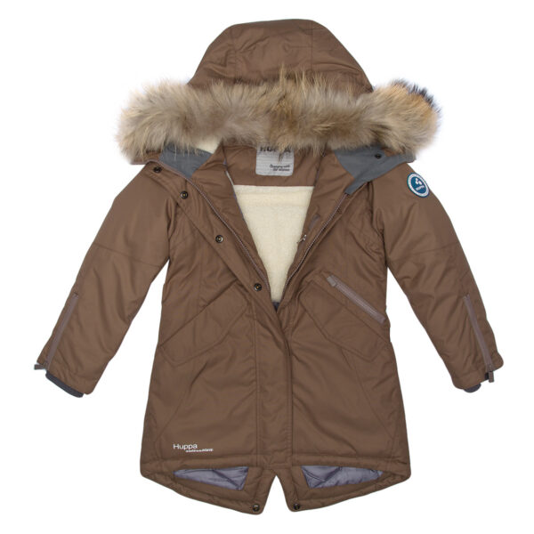 Children’s waterproof and windproof winter parka. Breathable fabric. Soft fabric on the inside. Faux sheepskin lining at the top of the back and inside the hood. Adjustable hood. Ribbed cuffs at sleeve ends. Two-way zipper covered with stud-press flap at front. Magnetic fastening on flap pockets. Drawstring tunnel with stoppers on waist. Waterproof taped seams. Removable natural fur trim on hood. Reflective elements on fabric.