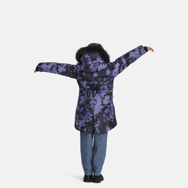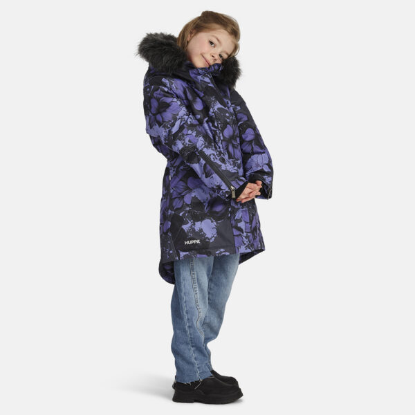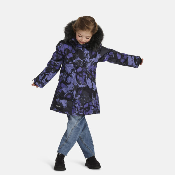 Bērnu ūdens un vēja necaurlaidīga ziemas jaka. Gaisu caurlaidīgs virsējais audums. Jakas odere no mīksta auduma. Muguras augšdaļā un kapuces iekšējos sānos jērādas imitācijas odere. Regulējama kapuce. Rievotas piedurknes. Priekšpusē apšūts divvirziena rāvējslēdzējs. Magnētiski aizdarāmas kabatas. Jostas vietā aizdare ar stoperi. Ūdens necaurlaidīgi līmēti izšuvumi. Kapucei noņemama mākslīgās kažokādas mala. Auduma virspusē atstarojošas detaļas.
