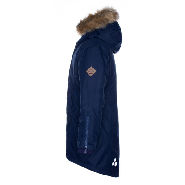 Children’s waterproof and windproof winter parka. Breathable fabric. Soft fabric on the inside. Faux sheepskin lining at the top of the back and inside the hood. Adjustable hood. Ribbed cuffs at sleeve ends. Two-way zipper covered with stud-press flap at front. Magnetic fastening on flap pockets. Drawstring tunnel with stoppers on waist. Waterproof taped seams. Removable faux fur trim on hood. Reflective elements on fabric.