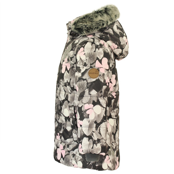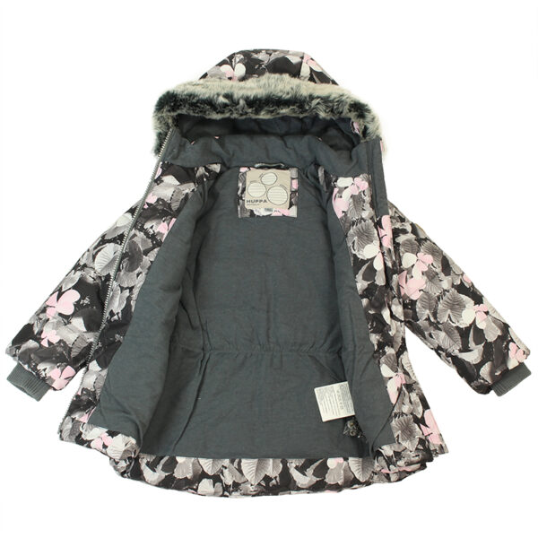 Little girls´ winter jacket with 300g insulation. The lining of the jacket is soft cotton flannel and the outer fabric is wind and water resistant. The inner ribbed cuffs on the sleeves of the jacket keep the child warm and dry. To ensure the child is visible even in the dark, the jacket has been equipped with reflective details and the front of the chest is decorated with a reflective detail. The removable hood is safe for playing outside – it is fastened with snaps to prevent getting caught, and its fur edge is also removable.