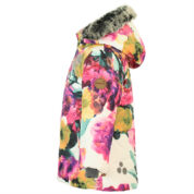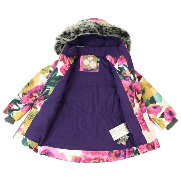 Little girls´ winter jacket with 300g insulation. The lining of the jacket is soft cotton flannel and the outer fabric is wind and water resistant. The inner ribbed cuffs on the sleeves of the jacket keep the child warm and dry. To ensure the child is visible even in the dark, the jacket has been equipped with reflective details and the front of the chest is decorated with a reflective detail. The removable hood is safe for playing outside – it is fastened with snaps to prevent getting caught, and its fur edge is also removable.