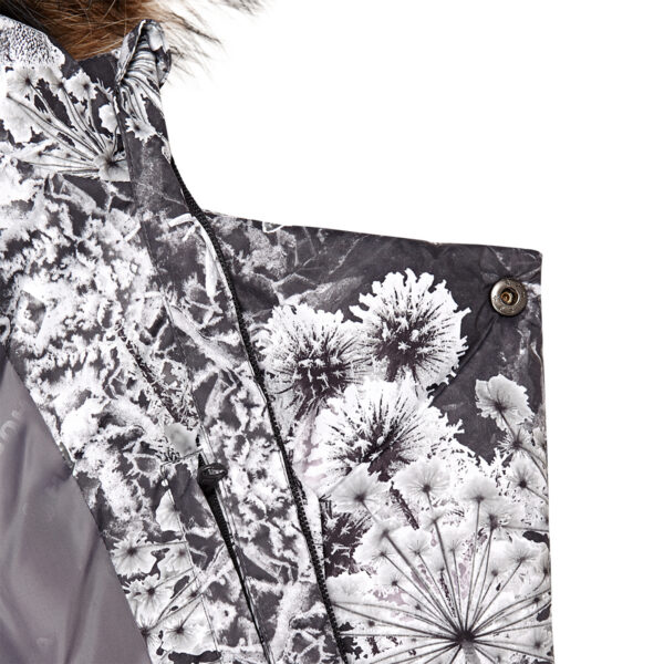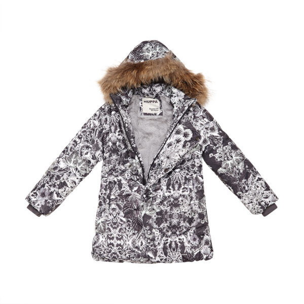 Children’s waterproof and windproof jacket. Breathable fabric. Soft mesh lining on the inside. Teddy Fur lining in hood. Removable snap-on hood. Ribbed cuffs at sleeve ends. Two-way zipper covered with diagonal stud-press flap at fron.t Jetted zipper pockets at front. Removable natural fur trim on hood. Reflective elements on fabric.