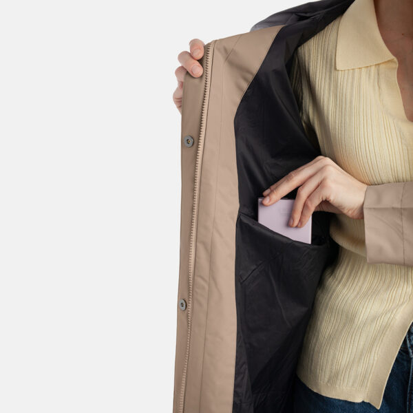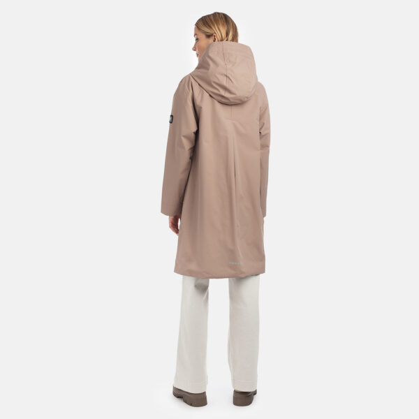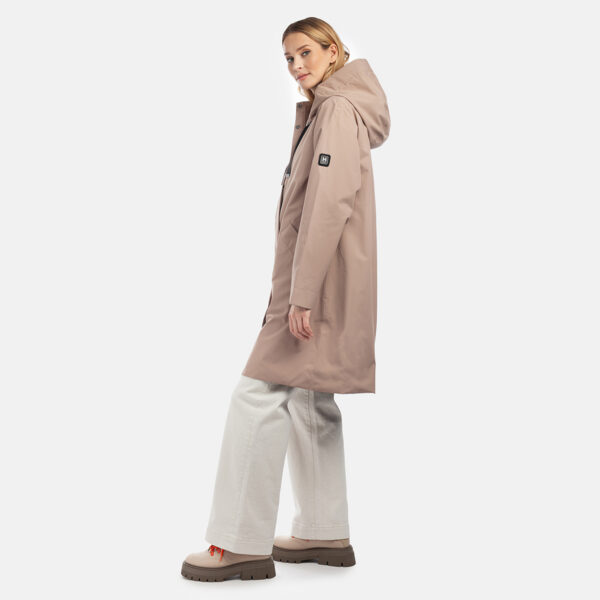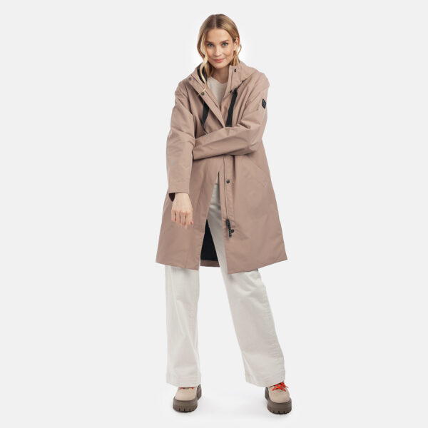 Sieviešu ūdensnecaurlaidīgs un vēja necaurlaidīgs mētelis, piemērots pavasarim un rudenim. Ārējais audums ir sauss pieskārienam – tas nozīmē, ka tam ir matēts efekts. Parkas odere ir mīksta. Regulējama kapuce un piedurkņu aproces. Ārējais audums ir dekorēts ar atstarojošām detaļām. Priekšējā aizdare ir aprīkota ar slēptām magnētiskām spiedpogām. Tas ir brīvāka piegriezuma mētelis.