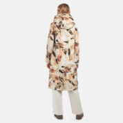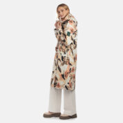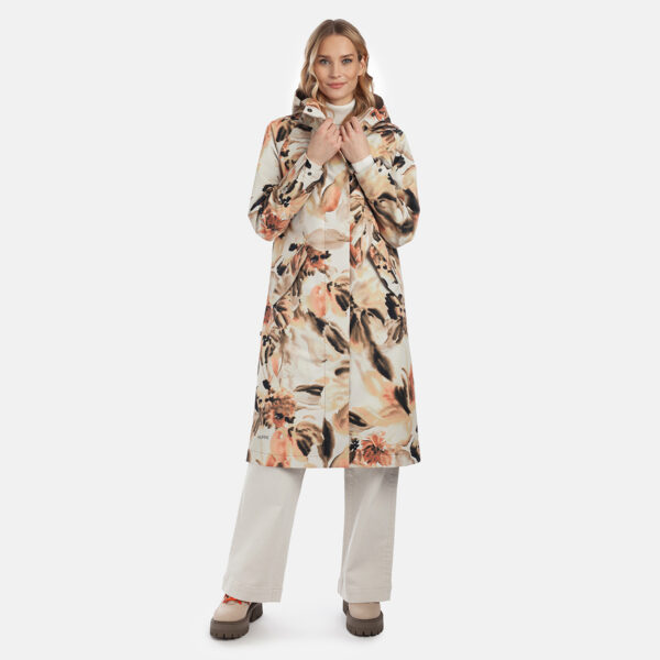 Plata piegriezuma sieviešu mētelis no “shell protect”- ūdens un vēja necaurlaidīga auduma. Regulējama kapuce un piedurkņu gali. Ūdensdrošas, nolīmētas šuves. Jostasvietā gumija ar fiksatoriem. Priekšējā aizdarē divvirzienu rāvējslēdzējs ar nosedzošu detaļu un spiedpogām. Uz virsējā materiāla atstarojošas detaļas.
