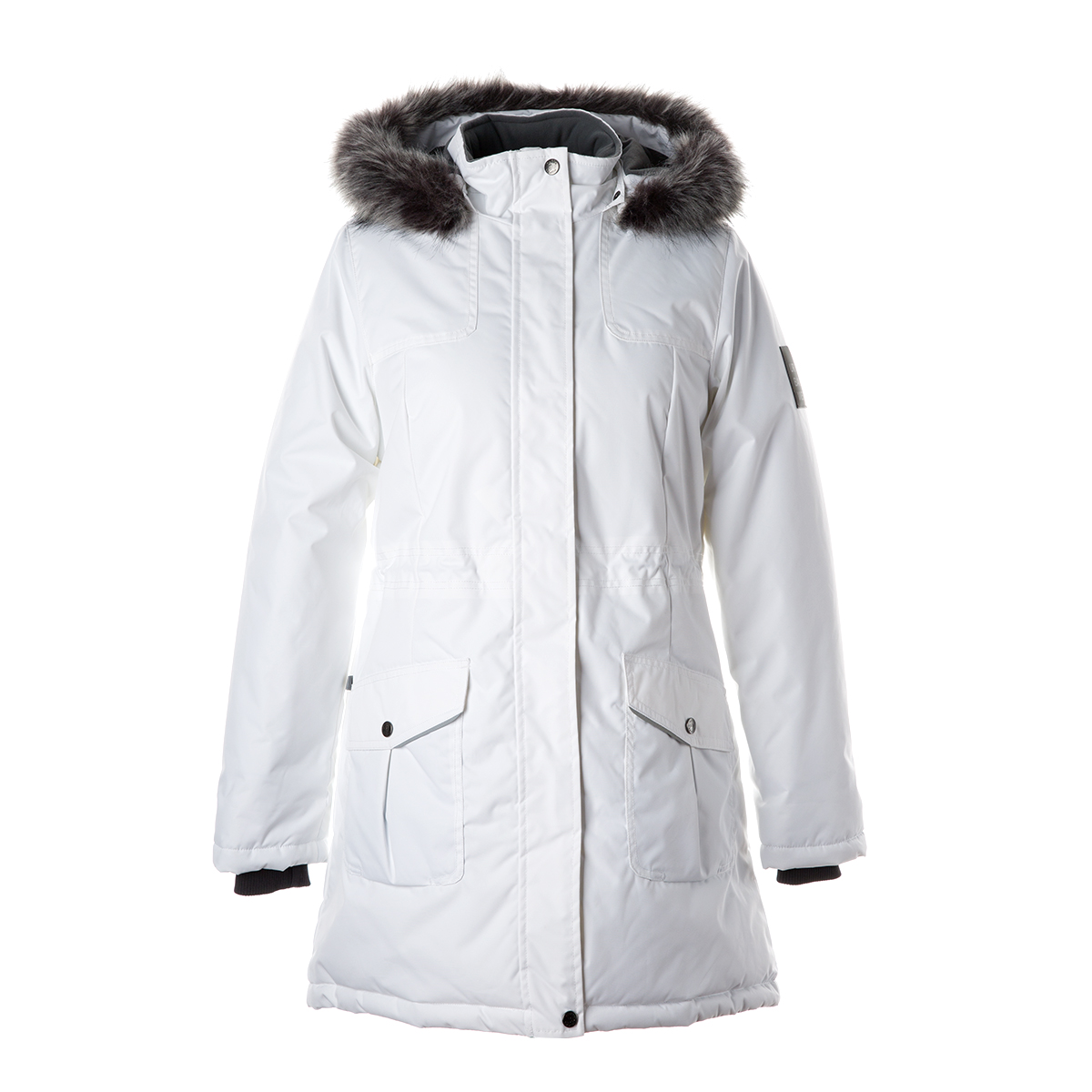 Sieviešu ūdens un vēja necaurlaidīga ziemas jaka. Gaisu caurlaidīgs virsējais audums. Mīksta jakas odere. Noņemamā kapuce pie apkakles piestiprināma ar velkro aizdari. Rievotas piedurknes. Jostas daļā aizdare ar stoperi. Ūdens necaurlaidīgi līmēti izšuvumi. Kapucei mākslīgās kažokādas mala. Auduma virspusē atstarojošas detaļas.