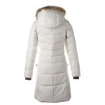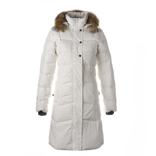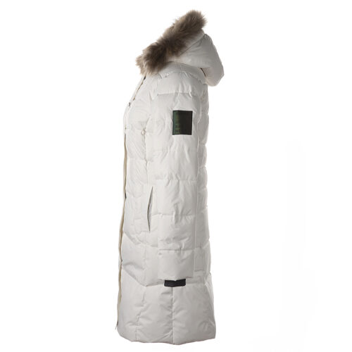 Moderns sieviešu ūdens un vēja necaurlaidīgs dūnu mētēlis Gaisu caurlaidīgs virsējais audums Mīksta mēteļa odere Pildījumā dūnu spalvas un spalvas Noņemamā kapuce pie apkakles stiprināma ar velkro aizdari Rievotas piedurknes Priekšpusē apšūts divvirziena rāvējslēdzējs Kapucei noņemama dabīgās kažokādas mala Labākai redzamībai tumšajā laikā mēteļa auduma virspusē ir atstarojošas detaļas