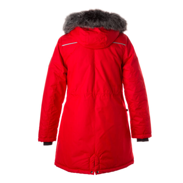 Sieviešu ūdens un vēja necaurlaidīga ziemas jaka. Gaisu caurlaidīgs virsējais audums. Mīksta jakas odere. Noņemamā kapuce pie apkakles piestiprināma ar velkro aizdari. Rievotas piedurknes. Jostas daļā aizdare ar stoperi. Ūdens necaurlaidīgi līmēti izšuvumi. Kapucei mākslīgās kažokādas mala. Auduma virspusē atstarojošas detaļas.
