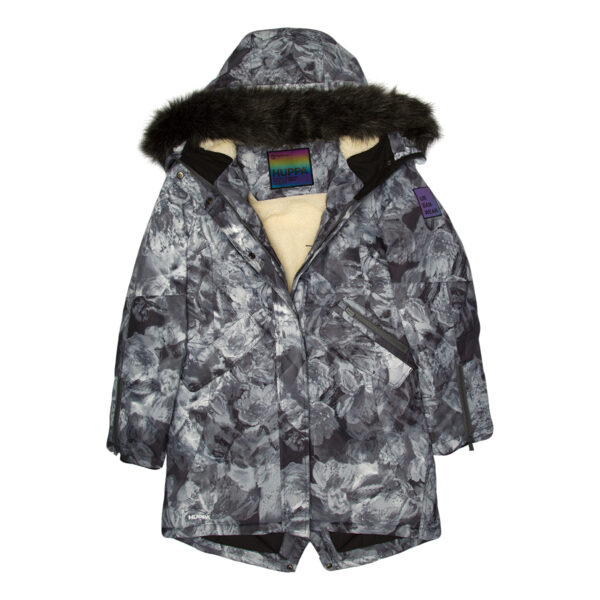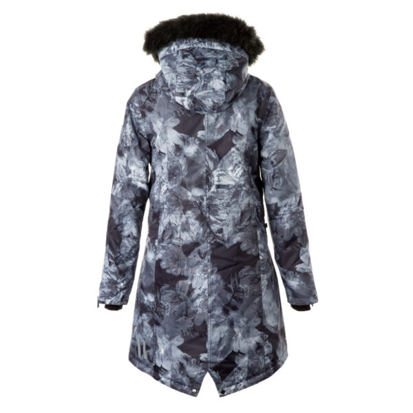 Sieviešu ūdens un vēja necaurlaidīga ziemas jaka Gaisu caurlaidīgs virsējais audums Jakas odere no mīksta auduma Muguras augšdaļā un kapuces iekšējos sānos jērādas imitācijas odere Regulējama kapuce Rievotas piedurknes Priekšpusē apšūts divvirziena rāvējslēdzējs Magnētiski aizdarāmas kabatas Jostas vietā aizdare ar stoperi, jostasvieta regulējama no iekšpuses Ūdens necaurlaidīgi līmēti izšuvumi Kapucei noņemama mākslīgās kažokādas mala Auduma virspusē atstarojošas detaļas
