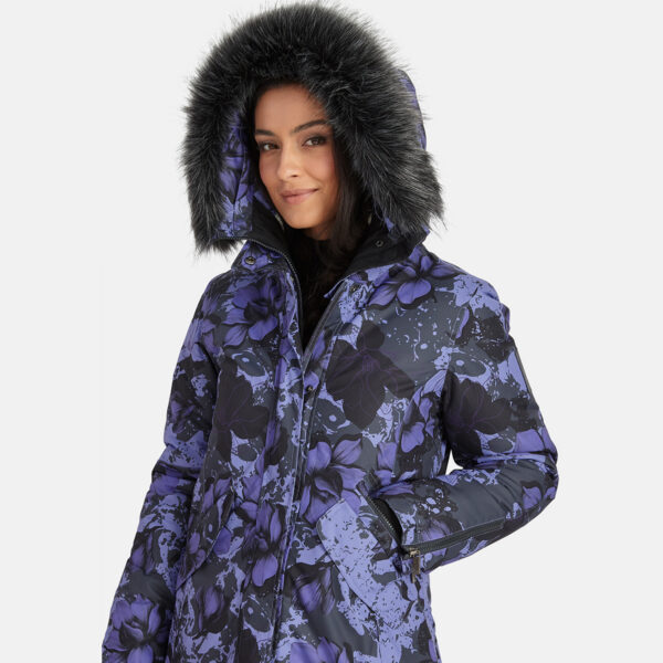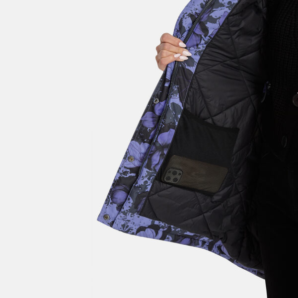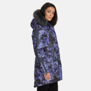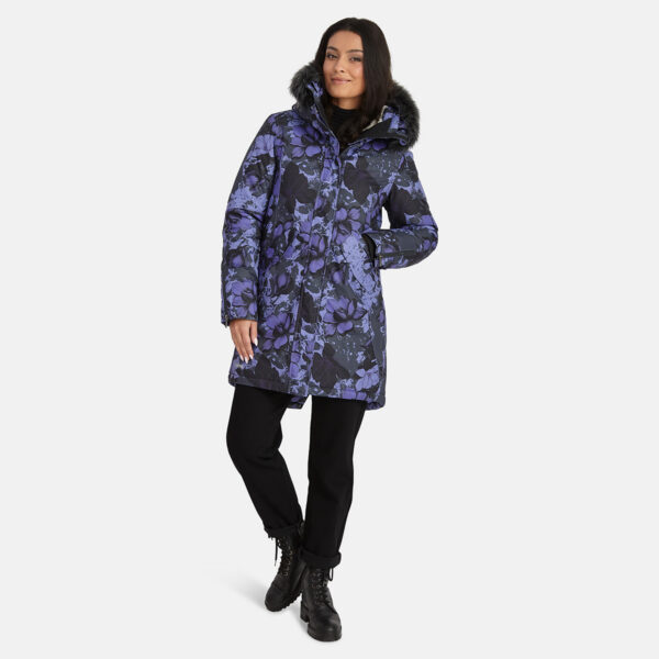 Sieviešu ūdens un vēja necaurlaidīga ziemas jaka. Gaisu caurlaidīgs virsējais audums. Jakas odere no mīksta auduma. Muguras augšdaļā un kapuces iekšējos sānos jērādas imitācijas odere. Regulējama kapuce. Rievotas piedurknes. Priekšpusē apšūts divvirziena rāvējslēdzējs. Magnētiski aizdarāmas kabatas. Jostas vietā aizdare ar stoperi, jostasvieta regulējama no iekšpuses. Ūdens necaurlaidīgi līmēti izšuvumi. Kapucei noņemama mākslīgās kažokādas mala. Auduma virspusē atstarojošas detaļas.