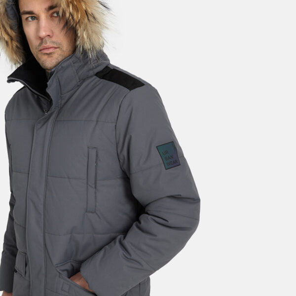 Vīriešu mīkstā auduma ziemas mētelis Ūdens un vēja necaurlaidīgs, gaisu caurlaidīgs virsējais audums Noņemamā regulējamā kapuce pie apkakles stiprināma ar velkro aizdari Rievotas piedurknes Priekšpusē apšūts divvirziena rāvējslēdzējs Priekšpusē esošās kabatas aizdarāmas ar magnētu Kapucei dabīgās kažokādas mala Auduma virspusē atstarojošas detaļas