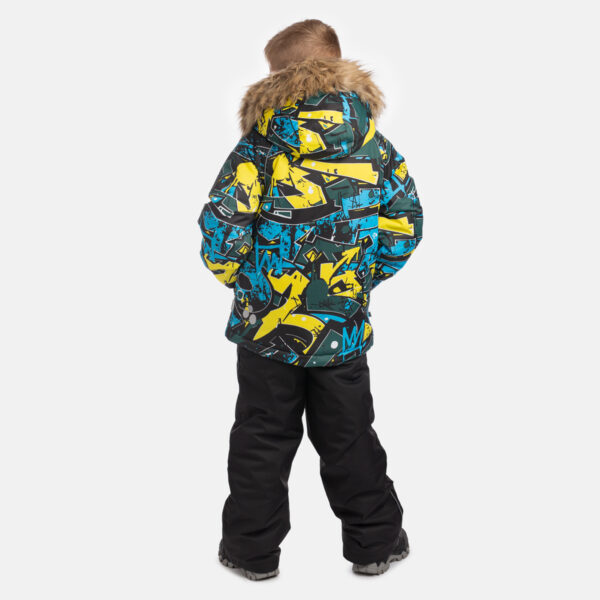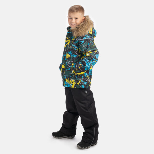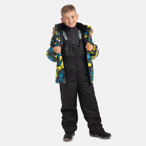 Bērnu jakas un bikšu komplekts. Ūdens un vēja necaurlaidīgs, gaisu caurlaidīgs virsējais audums. Jakai un biksēm ir mīksta odere. Piedurkņu un muguras daļā iestrādāta gumijas apdare. Noņemamā kapuce pie apkakles stiprināma ar velkro aizdari. Kapucei mākslīgās kažokādas malai. Biksēm ir augstais viduklis un regulējamas elastīgās lences. Jostas daļā iestrādāts gumijas paliktnis. Staras aizdarāmas ar stoperi. Ūdens necaurlaidīgi līmēti izšuvumi. Biksēm trūkst iekšējais staru apšuvums. Kā jakai, tā arī biksēm ir atstarojošas detaļas.