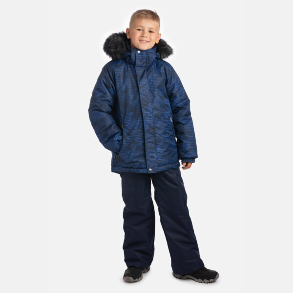 Bērnu ūdens un vēja necaurlaidīga jaka Gaisu caurlaidīgs virsējais audums Mīksts jakas oderes audums Noņemamā kapuce pie apkakles stiprinās ar velkro aizdari Piedurknes apstrādātas ar gumijas apdari Priekšpusē rāvējslēdzēja aizdare Priekšpusē aizdarāmas kabatas Kapucei noņemama mākslīgās kažokādas mala Auduma virspusē atstarojošas detaļas