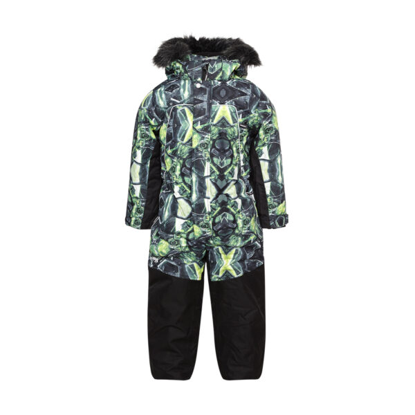 Bērnu ūdens un vēja necaurlaidīgs kombinezons Gaisu caurlaidīgs virsējais audums Mīksta iekšējā odere Noņemamā kapuce pie apkakles piestiprināma ar velkro aizdari Ap kapuci un aizmugurē regulējama gumijas apdare Ūdens necaurlaidīga priekšējā aizdare un kabatas Regulējamas piedurknes Rievota piedurkne ar vietiņu īkšķim Krāsaina gumijas apdare ar pogcaurumiem Kājgali no izturīgā Cordura auduma Sniega necaurlaidīgas bikšu staras Regulējama platuma bikšu staru gali Ūdens necaurlaidīgi uzlīmēti izšuvumi Auduma virspusē atstarojošas detaļas