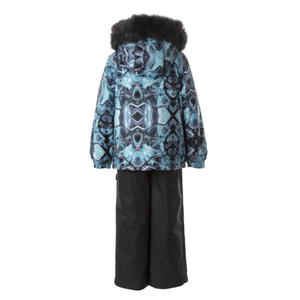 Bērnu jakas un bikšu komplekts Ūdens un vēja necaurlaidīgs, gaisu caurlaidīgs virsējais materiāls Jakas un bikšu odere no mīksta auduma Piedurknēs iestrādāta gumijas apdare Noņemamā kapuce pie apkakles piestiprināma ar velkro aizdari Kapucei noņemama mākslīgās kažokādas mala Biksēm ir augstā vidukļa daļa un regulējamas elastīgās lences Vidukļa daļā iestrādāta gumijas apdare Kāju daļas pasargātas no sniega mitruma Starās iestrādāti rāvējslēdzēji ar stoperi Ūdens necaurlaidīgi līmēti izšuvumi Kā jakai, tā arī biksēm ir atstarojošas detaļas