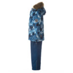 Bērnu jakas un bikšu komplekts. Ūdens un vēja noturīgs, elpojošs virsaudums. Jakas un bikšu iekšpusē ir mīksts oderaudums. Piedurkņu galos iestrādāta gumijas lente. Noņemamā kapuce pie apkakles nostiprināma ar spiedpogām. Kapucei noņemama mākslīgās kažokādas apmale. Biksēm ir paaugstināta jostasvieta un regulējamas, elastīgas bikšu lences. Jostasvietā iestrādāta gumijas lente. Staru galos sniega slēgi. Staru galos gumijas auklas tunelis ar atdurēm. Ūdensnoturīgas, stepētas šuves. Biksēm nav staru iekšējās šuves. Gan jakai, gan biksēm ir atstarojošas detaļas.
